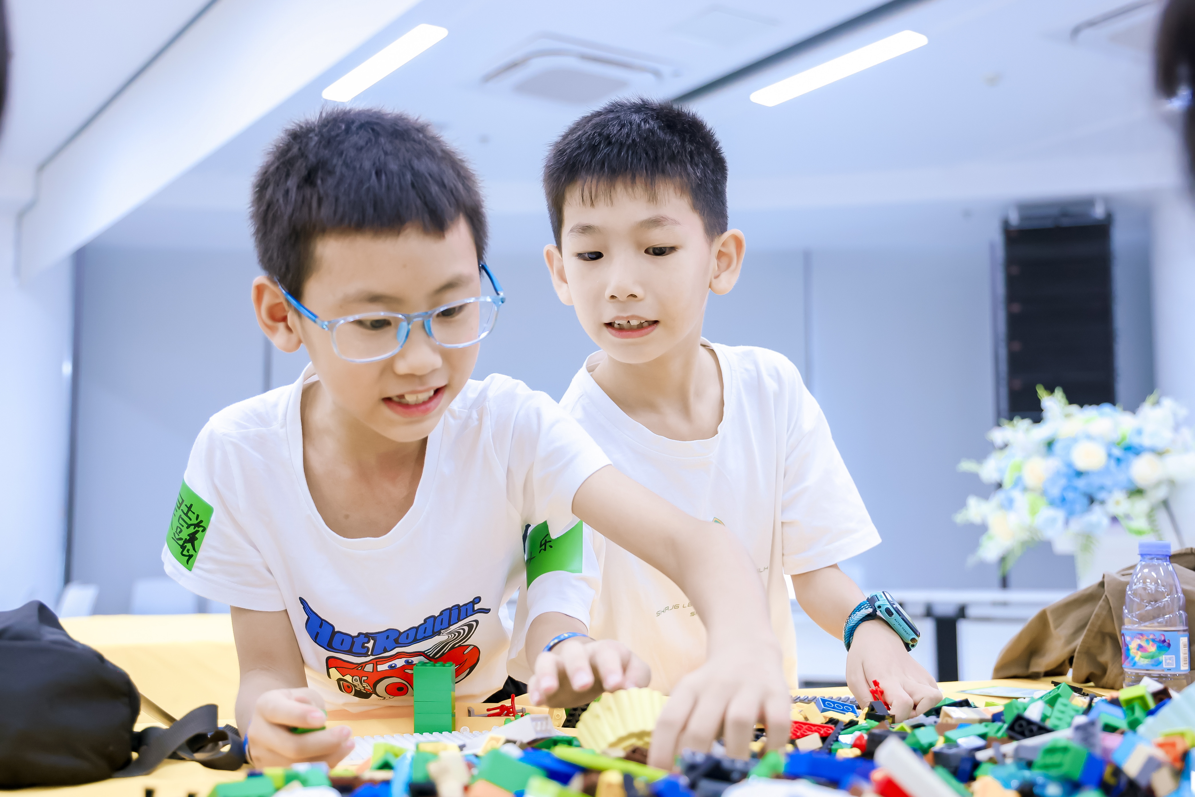 今日在广州市儿童活动中心,数千块不同颜色、不同形状的乐高®积木颗粒摆满了桌面,孩子们全神贯注地沉浸其中,双手忙碌地摸索,仔细挑选每一块积木,寻找理想的零件认真拼搭。历时一个多小时,一个个极具创意的作品在他们手中诞生。
